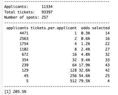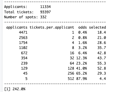 You can view the 2026 applicants and their ticket counts. We will be starting 369 runners in 2026. As we began in 2017, we are using a wait list model instead of overbooking like we had for decades to get the target number of starters which is the number we are legally allowed to run through the Granite Chief Wilderness. 112 of those 369 are automatic entrants resulting in 257 lottery spots. 254 of those will be selected in the lottery proper. The final three entrants to get to 369 will be selected from those in the audience. The probabilities of being selected as one of the 257 in the lottery are as follows: