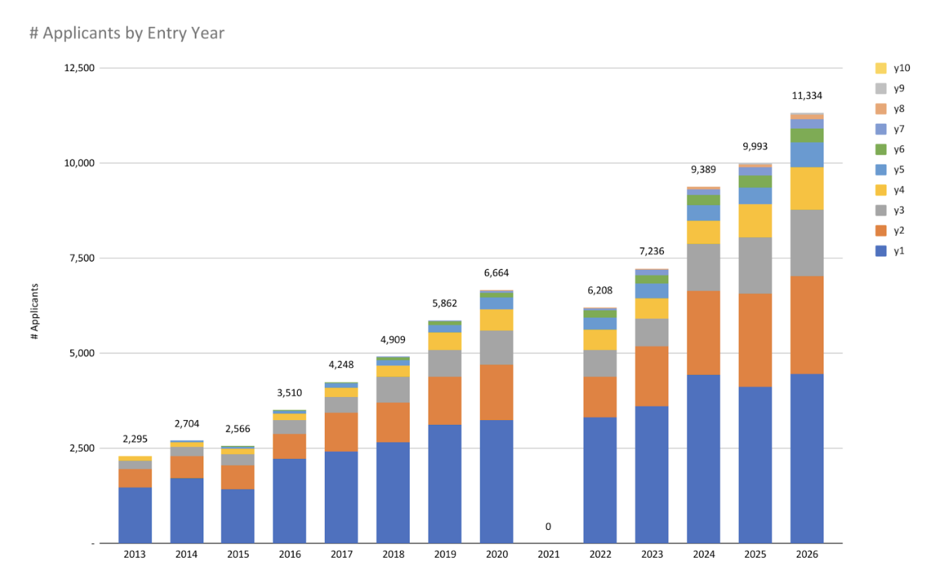 Each applicant ran a qualifying race of 100k or longer within the last year to be eligible to enter. Some have done so for many years. Each runner who enters the lottery and fails to gain entry into the Run (and otherwise doesn’t gain an entry via other means such as an aid station, sponsor, or HOKA Golden Ticket spot) will have additional tickets in the hat when entering the lottery the following year, thus improving the probability of being selected. Every lottery applicant will receive 2^(n-1) tickets in the hat where n is the number of years entering the lottery without gaining entry. That is, 1st year applicants = 1 ticket, 2nd year = 2 tickets, 3rd year = 4 tickets, 4th year = 8 tickets, and so on. The maximum number of years for the 2025 lottery is 10 years or 512 tickets.